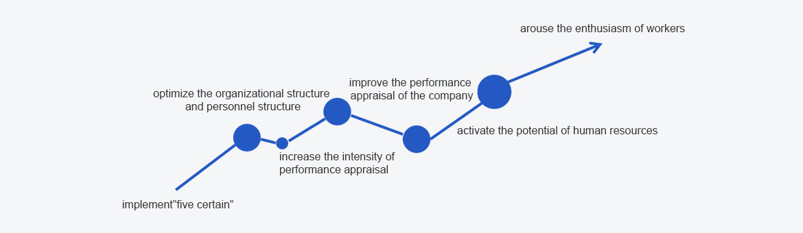 Company will work through the implementation of the "five certain", further optimize the organizational structure and personnel structure, increase the intensity of performance appraisal, improve the performance appraisal of the company, activate the potential of human resources, so as to arouse the enthusiasm of workers, finally realizes "person-job fit, job duty and responsibilities clear, streamlined and incentives are in place" in the human resources management goal, laying solid foundation enterprise development, enhance the vitality of enterprises.