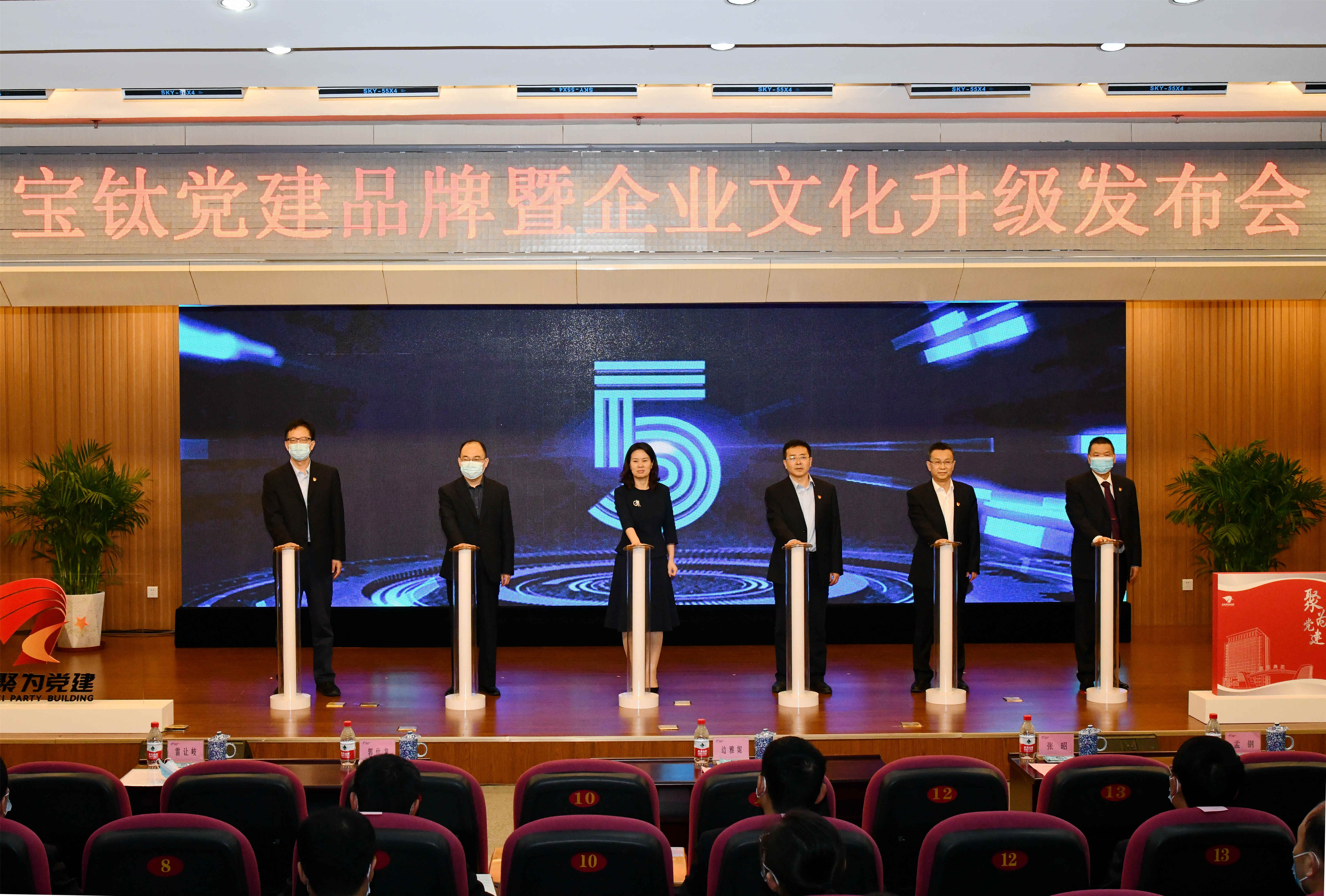 在磅礴大氣的音樂聲中,出席發(fā)布會(huì)的領(lǐng)導(dǎo)邊雅妮、郭仕龍、張昭、孟鋼及公司領(lǐng)導(dǎo)雷讓岐、王建超共同啟動(dòng)寶鈦黨建品牌暨企業(yè)文化升級(jí)發(fā)布儀式。伴隨著會(huì)場(chǎng)激動(dòng)人心的倒計(jì)數(shù)聲音“5-4-3-2-1-啟動(dòng)”,臺(tái)上領(lǐng)導(dǎo)右手輕觸發(fā)布柱上的金手印,六座發(fā)布柱瞬間點(diǎn)亮,寶鈦聚為黨建品牌、聚為文化正式發(fā)布!