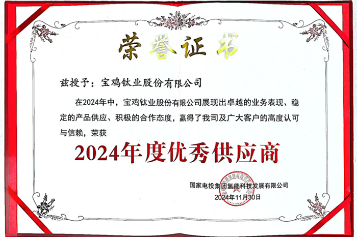 近日,在國(guó)家電投集團(tuán)氫能科技發(fā)展有限公司(以下簡(jiǎn)稱國(guó)氫科技)供應(yīng)商評(píng)比中,寶鈦股份從百余家供應(yīng)商中脫穎而出,榮獲“優(yōu)秀供應(yīng)商”稱號(hào),且為五家“優(yōu)秀供應(yīng)商”中唯一一家鈦材供應(yīng)商。